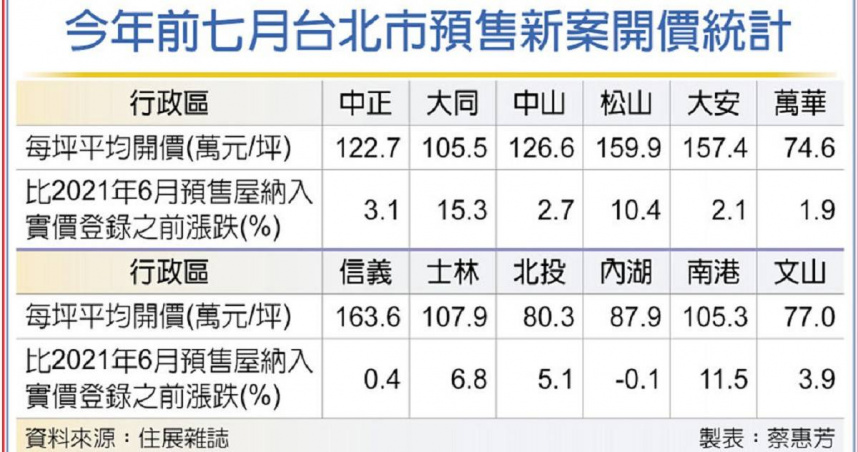 住展雜誌最新統計,台北市預售屋開價比去年6月預售屋納入實價登錄之前,每坪平均上漲12.5萬元、漲幅11.18%,且八個行政區單價突破百萬大關。